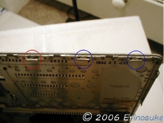 写真2:フックが3つ.青で囲んだ右2つは力業ではがしたが,赤の左は探針で引っかけて外す.これが外れたら楽勝.あとはマニュアル通りHDを外し,CompUSAで買ってきたHDに入れ替えて終了.序でに80GBだったのを100GBにしてみた(写真3).Samsung製しか無かったのだが,日本製のが良いのだろうか.