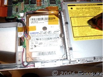 これが外れたら楽勝.あとはマニュアル通りHDを外し,CompUSAで買ってきたHDに入れ替えて終了.序でに80GBだったのを100GBにしてみた(写真3).Samsung製しか無かったのだが,日本製のが良いのだろうか.
