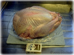 「大きいの丸ごと一羽じゃ家族で食べきれないわよ.骨付き胸肉だけのにしたら?」とも忠告もされたが,夫の希望で結局若七面鳥丸ごと一匹を購入.確かにスーパーでは小さく見えたのだが・・・.
