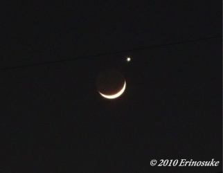 タイトル通り.夜8時半頃撮影.金星が月に最接近の日.もちろん,実際に接近してるわけじゃなく,「一番近づいて見える」ということらしい.