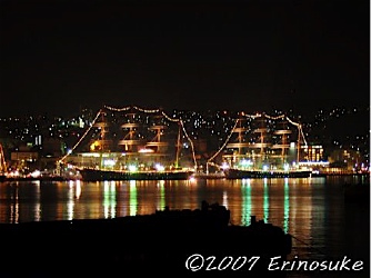 夜は花火が上がったのだが,常にルーズな我が家,開始時間に家を出て,対岸に着いたときにはとっくに終わって見物客はみな帰途へ.でも花火が上がったのって,ほんの20分程度なんだよね.なのに帆船祭り会場側も対岸も人出は多かった.