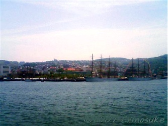 祭り自体は混むから行かなかったのだが,対岸から帆船を見た.
