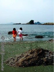海岸で波と戯れる幼児達.お~い,潮が満ちてきてますぜ.お前ら.