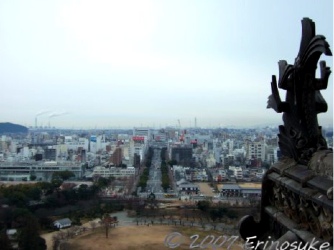 天守閣最上階からみた姫路駅方向.最上階にはおみやげ屋か?!と思いきや,質素に祠と警備員さんのみ.