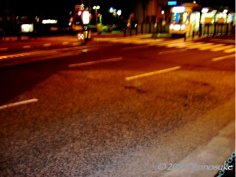 出島前の国道.かつて出島の端はこの国道まであったそうで,路面の色を変えて出島エリア部分を示している.奥に見える路面電車の駅と駅前の道路にも境界線を示す印がアリ.つまりこのあたり,昔は海だったわけで.長崎市の平地部分は埋め立てが多い.