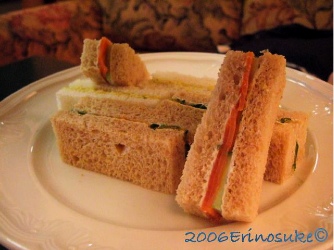 6.3段目はサンドイッチ.スモークサーモンとハムサンドとカレー味サンド.これも美味い!バンクーバーで食べた所は何処もパンがおいしかった.日本のと同じくしっとりしたパンである.