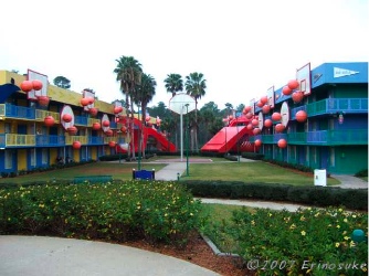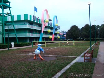 より).ディズニー直営ホテルでも一番安いホテルである.すごいのは外見.各棟毎にスポーツをテーマに漫画みたいなデコレーションが施されているのである.他にもMovie