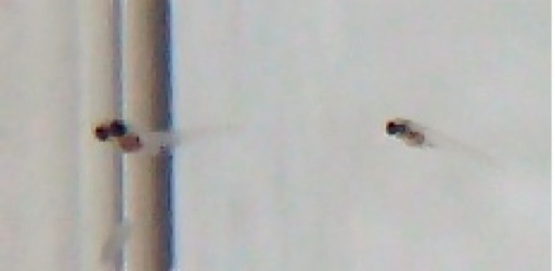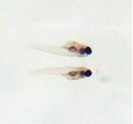 産まれて1ー2日目のめだかの写真.普通のデジカメで接写モードで取ったが,小さすぎて(1-2 mm),かなり拡大.