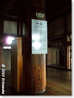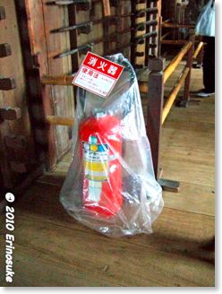 大きな消化器と大黒柱.写真だとわかりにくいが,この消化器,超でかい.家庭用の3倍はありそう.ビニールカバーで見えないが,後ろにキャスターが付いている.