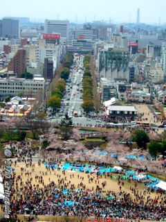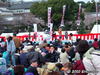 場内麓の広場でのイベント.せんと君と姫路城のマスコットが対峙する側で,観客は飲めや歌えや花見に興じる.